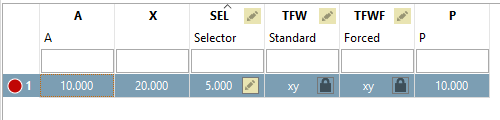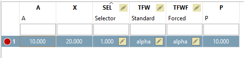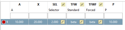 The start values are displayed when the table is loaded. The start value is represented by the first parameter set in the formula [Equation]. For the selector this is 1, for TFW (TMA) and TFWF (TMAF) the value "alpha" due to the condition set.
