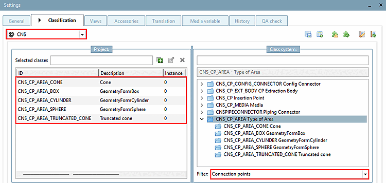 For this purpose, the desired class for the creation of a cuboid, cylinder, sphere, cone or obtuse cone is assigned to a certain connection point ( "Connection points [Connection points]"filter [Filter] ) in PARTproject under Type of Area.