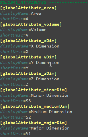 Global attributes: xDim, yDim, zDim, minorDim, mediumDim, majorDim, area, volume, thickness, axisSym, planeSym, shape.
