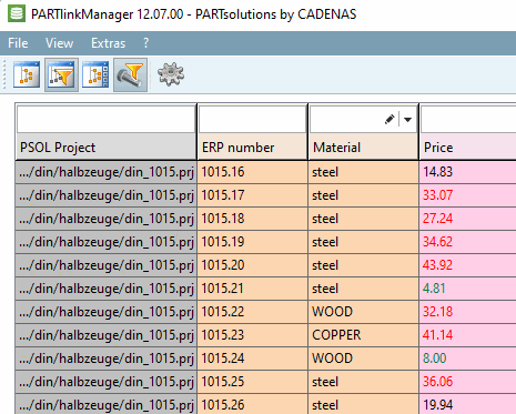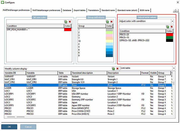 Setting in user interface under PARTlinkManager -> Extras menu -> Configure dialog window -> tab page PARTlinkManager settings [PARTlinkManager preferences] -> dialog area Adjust table values -> Adjust color with condition