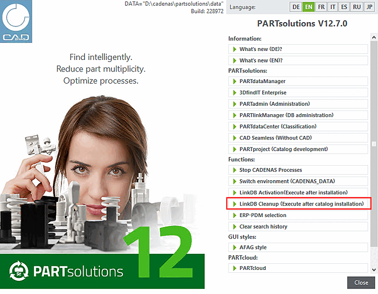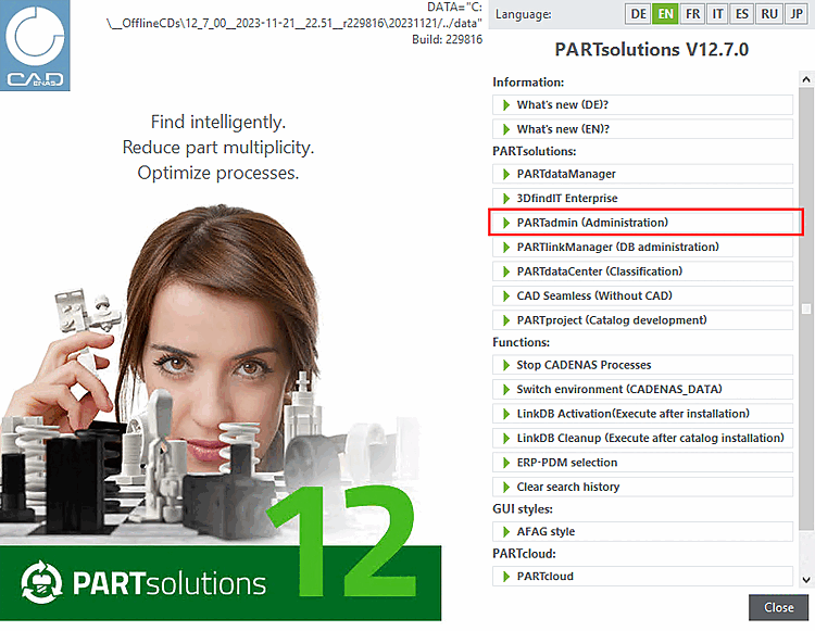 -> PARTadmin is opened and the version numbers and link database are updated. Depending on the size of the catalog, the process may take a few minutes.