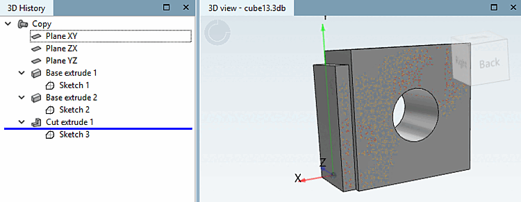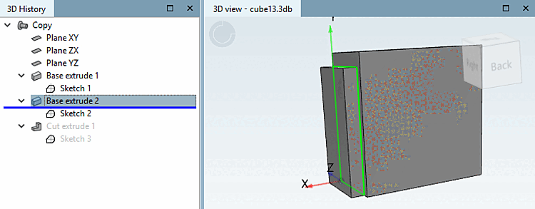 In the 3D history [3D History] docking window, you can "jump" to any point in the construction process by moving the blue horizontal line. This means that the 3D view shows the component in the corresponding design phase.