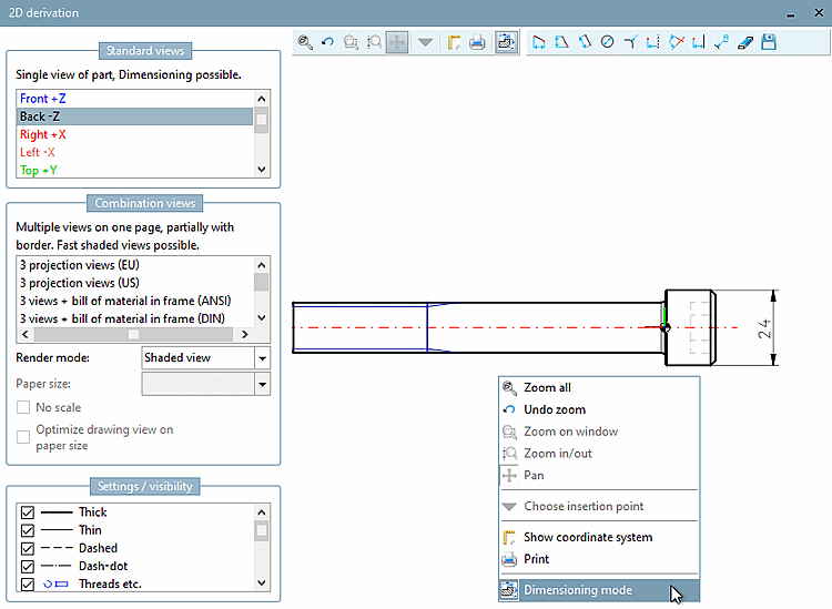 Before you export a 2D derivation into the CAD system, you can add a dimensioning.