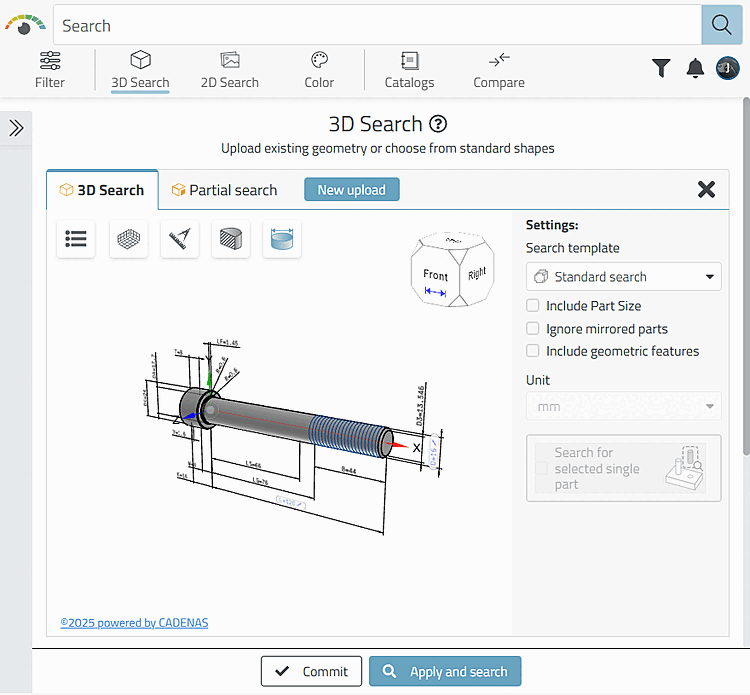 Use your own model for the search. Simply drag the desired part into the designated area File here [Drop file here], use a file from the clipboard by clicking & pasting or select a part using the File selection button.