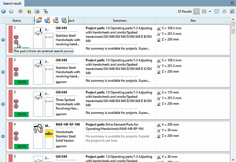 External results can be opened, but all actions such as transfer to CAD, etc. are deactivated. If corresponding parts are to be used, either download the corresponding part from the portal or install the corresponding catalog locally via PARTadmin.