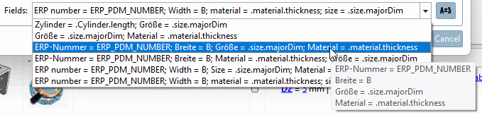 Here, the variable ERP_PDM_NUMBER, table variable for width and topological attributes for Size and Material thickness have been added to the analysis result.