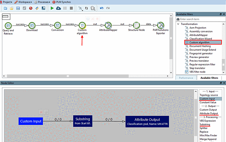 To do this, use the Custom algorithm node in the Available filters docking window under Transformation.