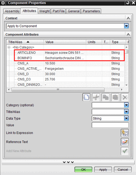 Attributes that are declared in the [CadDocumentAttributes] block are displayed in NX in the Component Properties dialog in a list with the standard attributes.