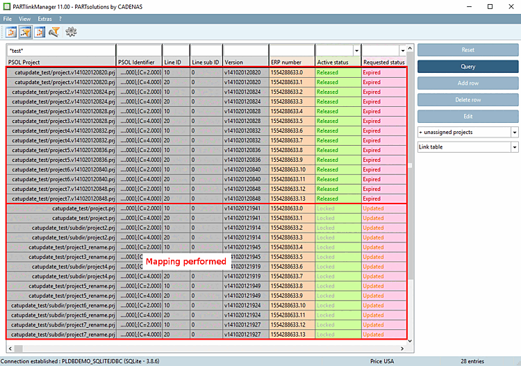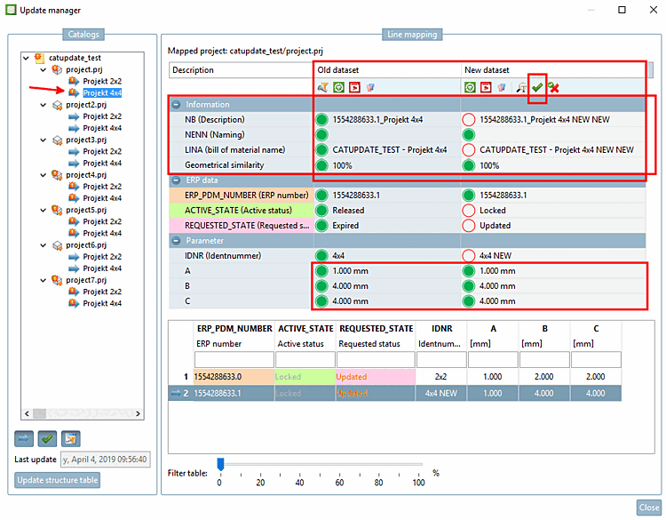 In the Update Manager [Update manager], you can recognize a successful mapping by the fact that both the Old data record [Old dataset] column and the New data record [New dataset] column contain data in the Row assignment [Line mapping] dialog area.