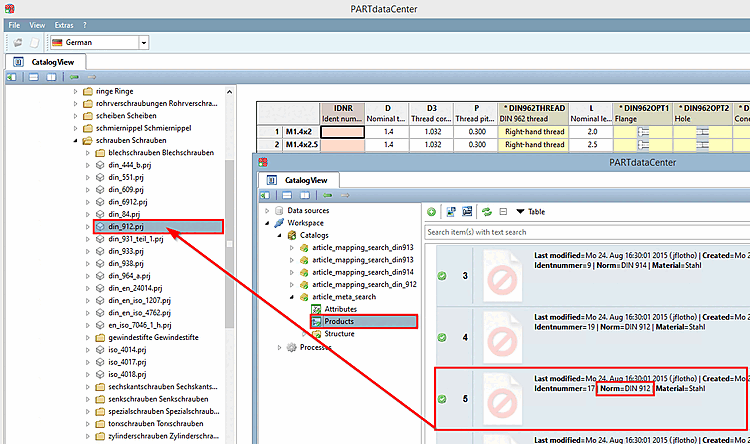 -> The tab page opens as a separate window. Position the two windows. Open the data records of the CSV file in one (Workspace [Workspace] -> CSV catalog name (self-assigned) -> Products ) and the corresponding project of the PARTsolutions catalog in the other (Data sources [Data sources] -> PARTsolutions Catalogs [PARTsolutions catalogs] -> Catalog -> Structure -> Directory -> Project).