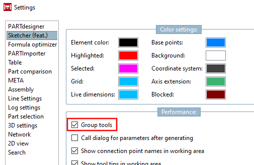For a better overview, the individual function buttons are grouped together in toolbars with similar functions. In V12, only the last one used is displayed, the others can be accessed via a list box function (small black arrow). In the PARTdesigner under Extras menu -> Settings [Preferences...]... -> Sketcher (hist.) [Sketcher (feat.)] there is the option Group tools, so that you can also return to the old V11 behavior (all buttons are visible).