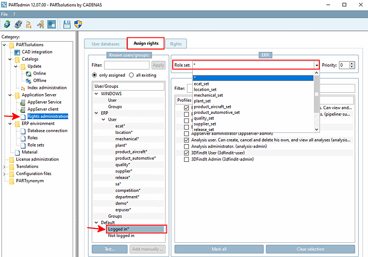 Select the Rights assignment [Assign rights] tab page, under Users/Groups [Users/groups] select Logged in * and open the list field under Role set.