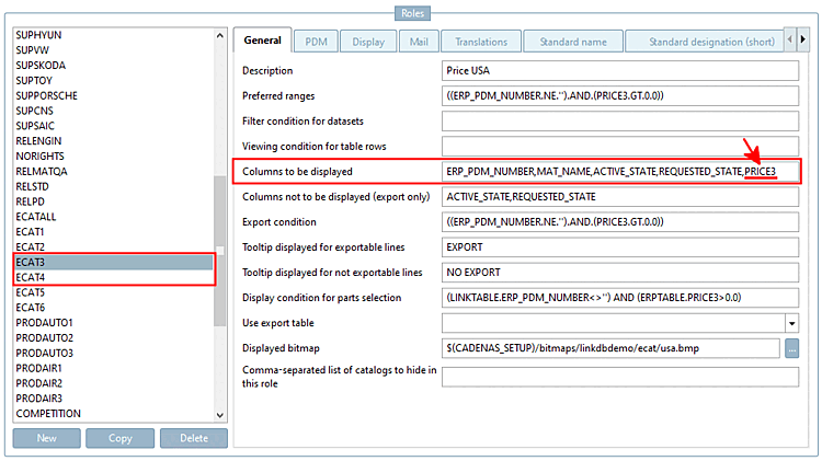 The "PRICE3" column is entered under Columns to be displayed. If you select the role "ECAT4", you will see the column "PRICE4" ("Prices country GERMANY").