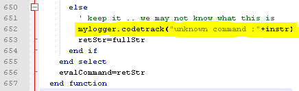 If a called command is not available, code tracking can be used to find out which command this unknown command is, because it is then added to the log with the entry evalCommand: