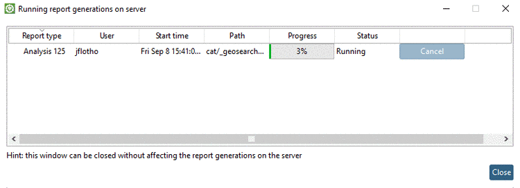 -> The analysis is started. In the dialog box Running report generations on server you will get informed about the progress.