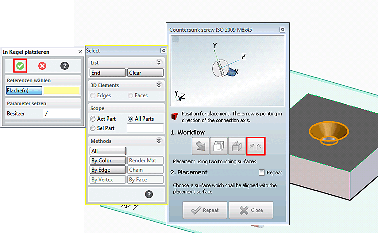 the view changes to CoCreate Modeling and the PARTsolutions placement dialog opens.Select the desired placement method under 1. Select method using one of the following buttons: