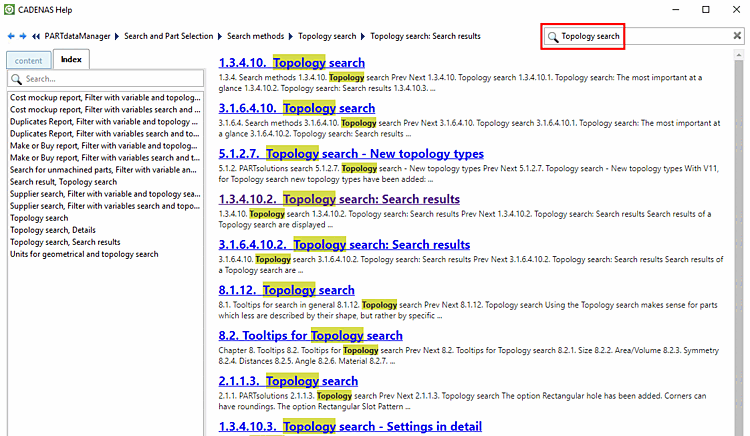The search result shows the matching index terms in parallel on the left so that you can also filter further there.