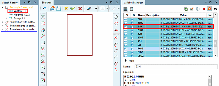After selecting the variable Z1H, the affected sketch is highlighted in yellow in the 3D history [3D History].
