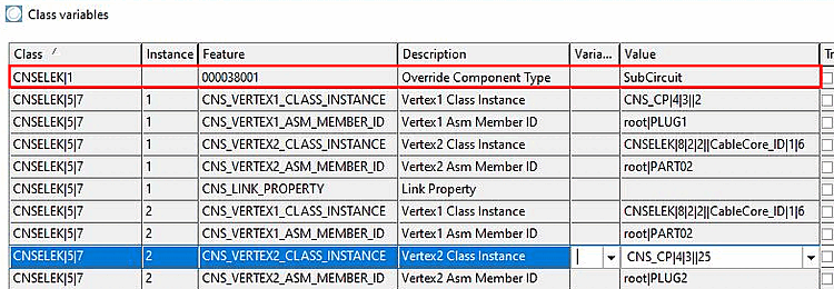 Subcircuits directly follow the general procedure described above. However, in order to create an explicit subcircuit, the class CNSELEK|1, with the characteristic Override Component Type, must be written with the value "SubCircuit" at the assembly level. This requires consistent modeling of the inter-part links.