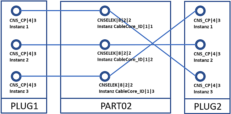 The CNS class CNSELEK|5|7 (Inter Part Links ) works at this level. This class makes it possible to establish connections between general class instances at an abstract level (two nodes [vertex]). Note that in the example above, the individual pins are instances of the class CNS_CP|4|3 (electrical connection); the wires of the cable are instances of the class CNSELEK|8|2|2 (cable wire). For this reason, the above table contains 6 connections. I.e. a connection from the pins of part 1 to the left side of the cores as well as connections from the right side of the core to the pins of part 2.