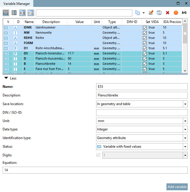 Sort variables you can change the position in the characteristic attribute table (not in the variable manager) as required.-> If a variable is intended for use in the geometry (i.e. storage location [Save location] "Only in geometry [Only in geometry] " or "In geometry and table [In geometry and table] "), the name is marked with an asterisk as long as the variable has not yet been used.