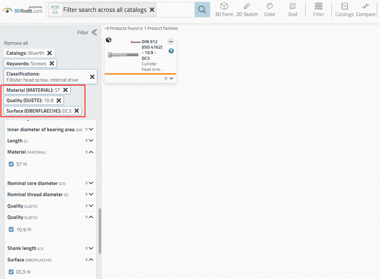 -> In the course of specifying, more and more variable filters are shown (for screws nominal thread diameter and length, for example).