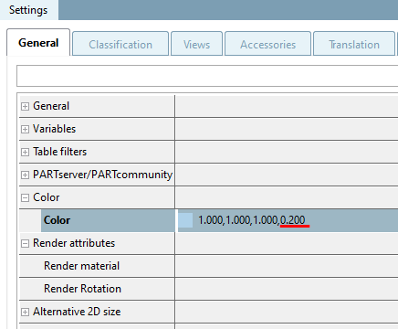 There is no transparency for the SYS_FaceAttributeColor (face color) face attribute. Therefore, the transparency setting of the part always wins here, either from Color and Texture [Color and texture] → Edit [Edit material for 3D preview] color [Color] or from Material for 3D preview [Edit material for 3D preview].