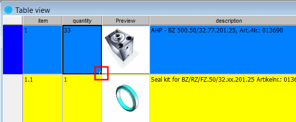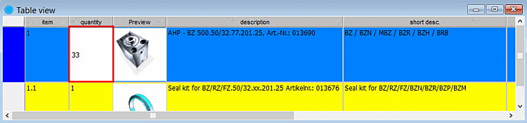 The currently selected line [Row] can always be recognized by the blue field on the left. If you double-click in the blue field - provided the respective individual part has been transferred from PARTsolutions - the PARTdataManager is started and the part is displayed in the parts view [Part view].