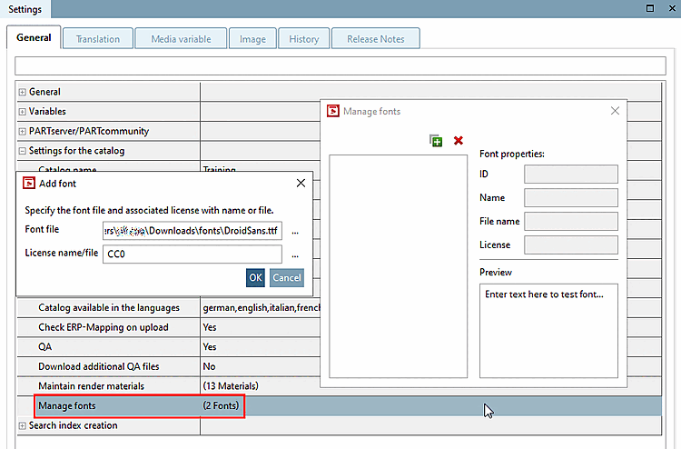 If you click on the plus sign, the Add font dialog box opens. Specify the font file [Font file] and license name/file [License name/file] and confirm with .