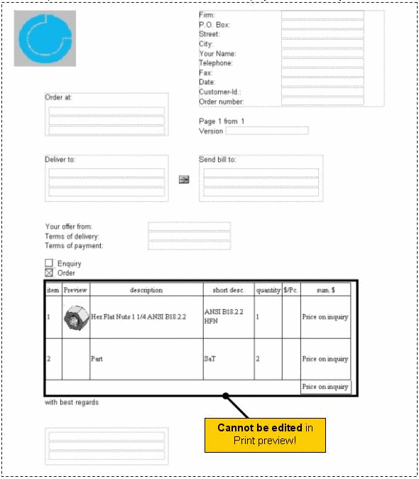 The Print preview table transfers the changes within the Hierarchical view and the Table view. In other words, if the now named menu areas delete/insert a part, for example, or change field inputs the table adjusts itself accordingly in the Print preview.