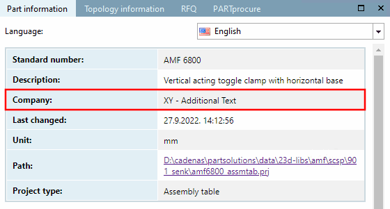 The catalog designation [Catalog name] is displayed in the part information [Part information] under Company, for example.