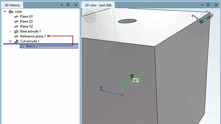 Click on the area [Face] in which the hole is located. --> The corresponding sketch [Sketch] appears in the history [History] with a colored background.