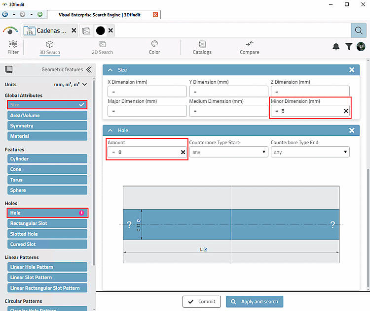 Open the 3D search [3D Search] and then click on Advanced search for geometric features.
