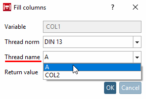 To fill columns with values from the thread tables, use the context menu command Fill column with thread information in the column header of the table. Values for nominal diameter (ND), thread pitch (PITCH), core diameter external thread (KDA) and core diameter internal thread (KDI) can be entered.