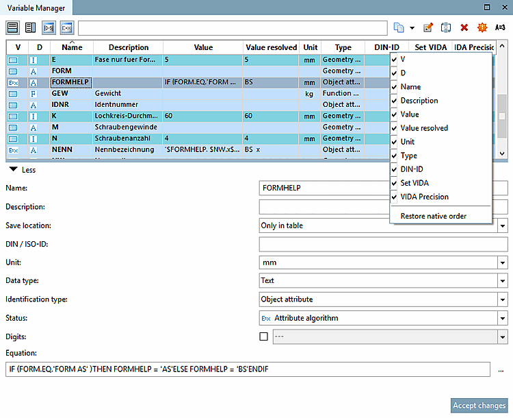 If the Variable with fixed values option was selected under Status, the checkbox is grayed out and the specification of decimal places is mandatory. The Set VIDA table column shows the entry "true".