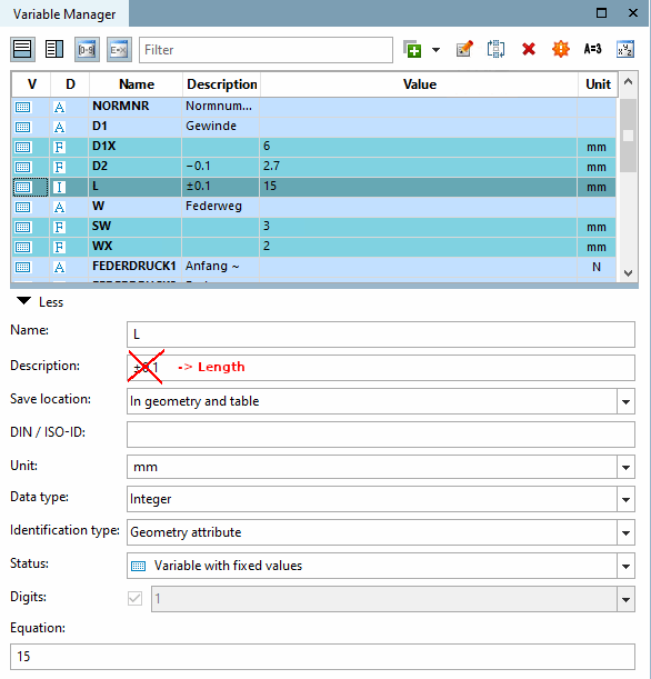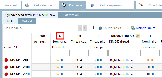The DIN ID contains the dimensional letter from the dimensional and/or product standard, e.g. D1 for the nominal diameter [Nominal diameter] of a screw. Dimensional letters, such as Greek letters (alpha), can also be written out as a word.
