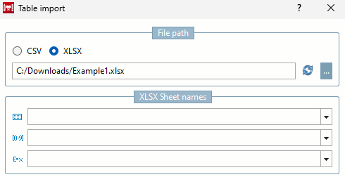 When choosing XLSX the additional selection area XLSX Sheet Names [XLSX Sheet names] appears. There you can find a select a specific sheet to import. If you enter the path manually, you must use the