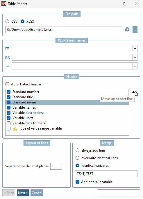 If the Automatically detect headers [Auto-Detect header] checkbox is activated, an attempt is made to automatically detect the headers to be imported when the dialog is opened (or when the checkbox is activated). This includes both the headers to be imported and their sequence. If all rows in the first column can be identified, the checkbox is activated and the manual header configuration is deactivated. Otherwise, it remains deactivated and the user must specify the header manually. Appropriate notification messages will appear from the system.