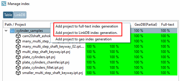 Tabbed page Index generation: Here you can start index generation in parallel for different index types. You can select the entire catalog, directories, projects or just individual lines.