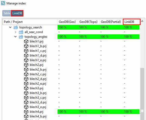 Tabbed page "LinkDB index [LinkDB index]": In this example, the project "iso_21269.prj" has 3 ERP numbers. The display of 33% means that only one of the three is indexed.