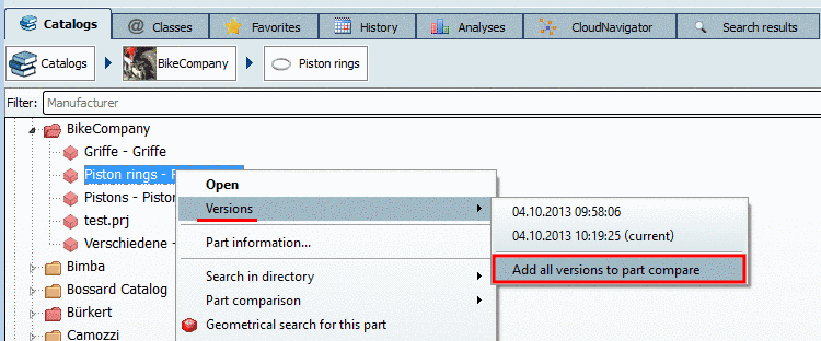If you kept the old versions during the catalog installation, you can open the these in the submenu of Versions or add them to the Part comparison.