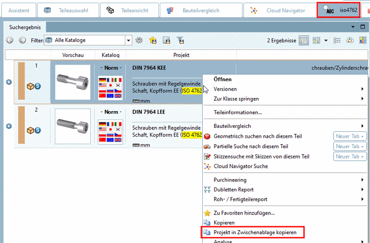 These commands are available at project level and within the search results. Herewith you can load parts into the Part comparison.
