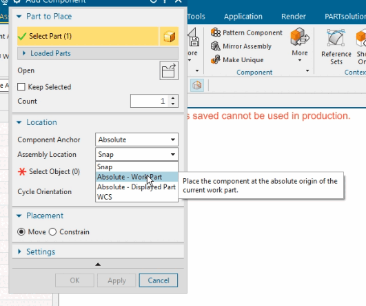 Open the list field under Assembly Location and select Absolute - Work Part.