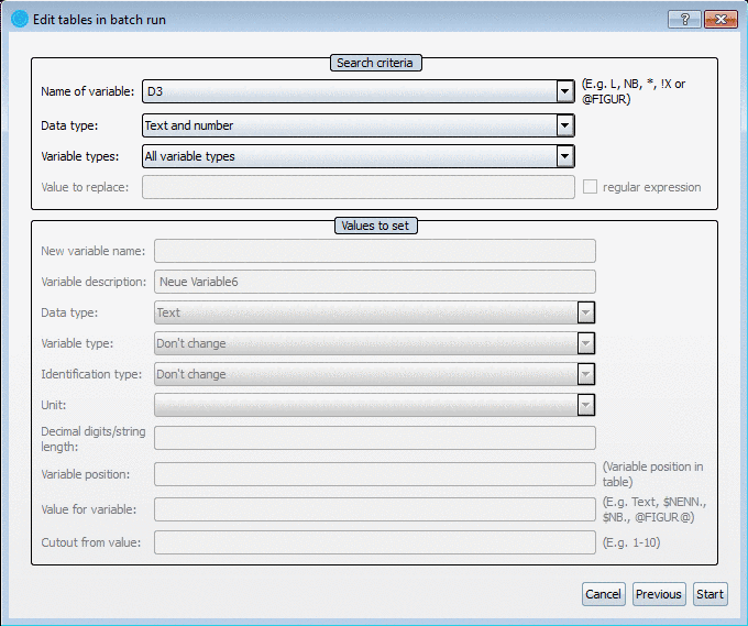 There are different ways to edit the table variables. Depending on the selected option Add variable / change variable value | Change value of variable | Replace variable value | Delete variables | Rename variable | Add variables from CSV / change variable values from CSV) in the list field at the very top, the respective input fields in the sections Search criteria and Values to set are active.