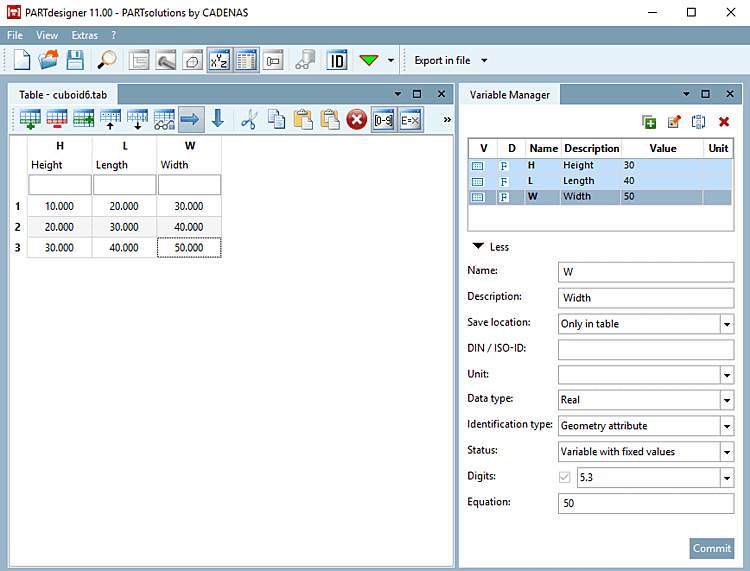 Create the variables L (Length), W (Width) and H (Height) for a cuboid in the variable manager [Variable Manager]. Details on the variable manager [Variable Manager] can be found at Section 7.8, “ Docking window " Variable manager" ”.