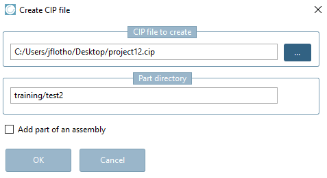 Standards directory [Part directory]: By default, the origin path of the project is already entered. If you do not change it, the *.cip file will also be saved in this path when it is called up.