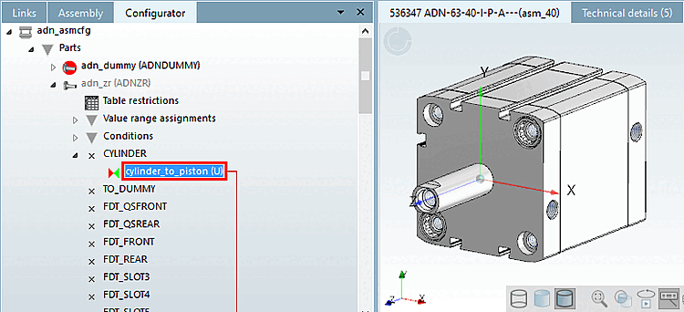 Switch to configuration mode in PARTdataManager and check which rule represents the connection between the moving parts - for example, between the cylinder and piston. Open the rule.