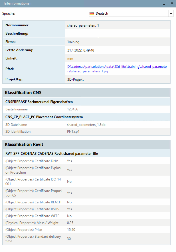 To create neutral shared parameters, CADENAS provides its own shared parameter file (which is supplied with the software [CADENAS_SOFTWARE\iface\revit\Common\CNS_Shared_Parameters.txt]).