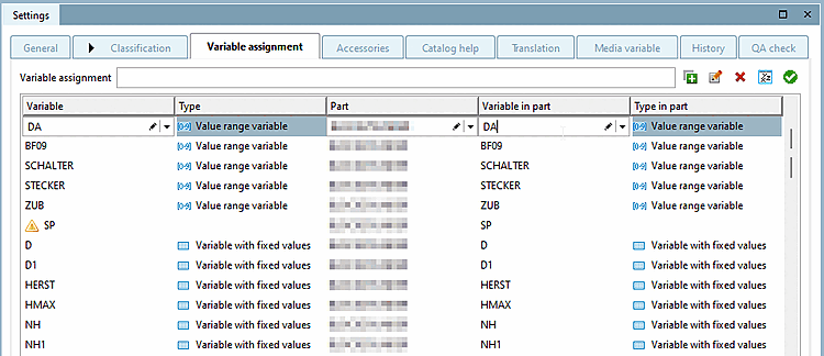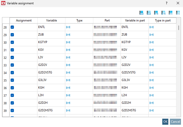 There you have the option of assigning all available variables in the assembly table to the component using the checkbox in the Assignment column. Using the quick selection above the table, you can select All or No variables with fixed values, All or No value range variables and All or No characteristic algorithms.