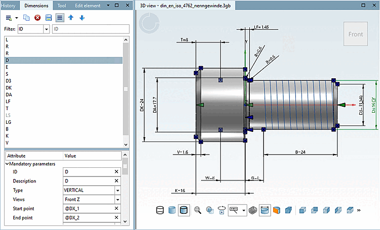 -> As soon as all mandatory parameters [Mandatory parameters] are set, the dimensioning appears in the 3D view.